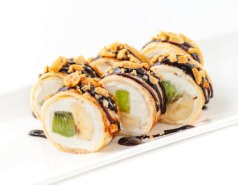 Блинчик, сливочный сыр, банан, киви, арахис, шоколадный топпинг.