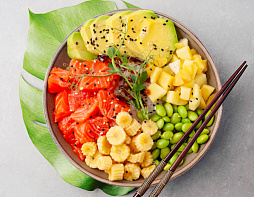 Основа на выбор, лосось, соус терияки, авокадо, манго, кукуруза мини, бобы эдамамэ, кунжут, бульон вок, кунжутное масло