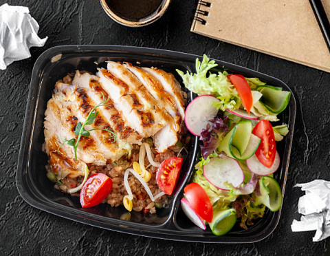1.Куриное филе, рис, бобы эдамамэ, яйцо куриное, томаты черри, перец болгарский