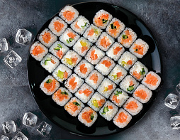 Пять ролов с лососем в сочетании с авокадо, огурцом, луком и сливочным сыром.
