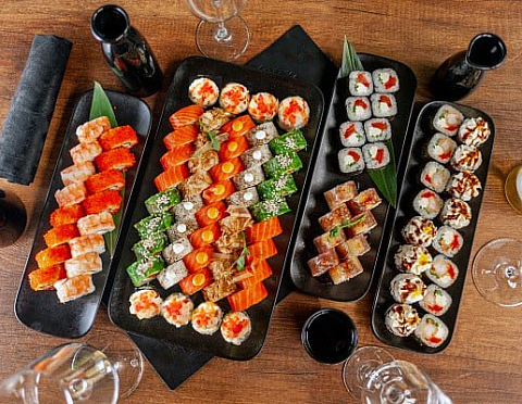 Ролл: Морской окунь темпура, японский омлет, грибы, соус Спайси, сливочный сыр, такуан, соус Терияки,