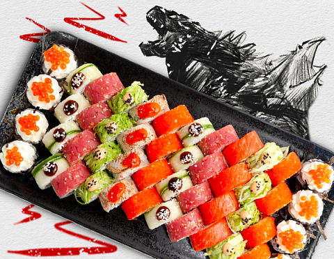 Морской окунь, сливочный сыр, огурец, соус Чили сладкий.
