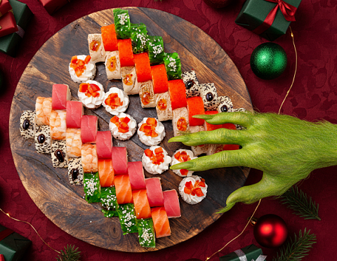 Ролл с сурими, икрой масаго, майонезом, такуаном, сливочным сыром, кунжутом, салатом чукка.(8шт)