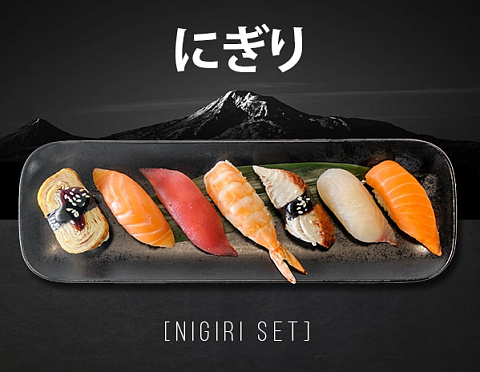 Нигири с японским омлетом, водорослями нори, соусом Терияки и кунжутом,