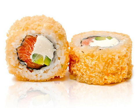 Лосось, огурец, сливочный сыр, соус Спайси, кунжут Ким-Чи, соус Терияки, рис, кляр, сухари Панко