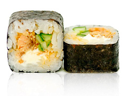Копченый лосось, морской окунь, огурец, перец сладкий, салат, сливочный сыр, майонез, икра летучей рыбы, соус Терияки