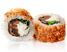 Морской окунь темпура, японский омлет, грибы, соус Спайси, сливочный сыр, такуан, соус Терияки.