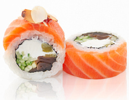 Лосось, сливочный сыр, огурец, тыква кампио, такуан, соус терияки, хлопья миндаля