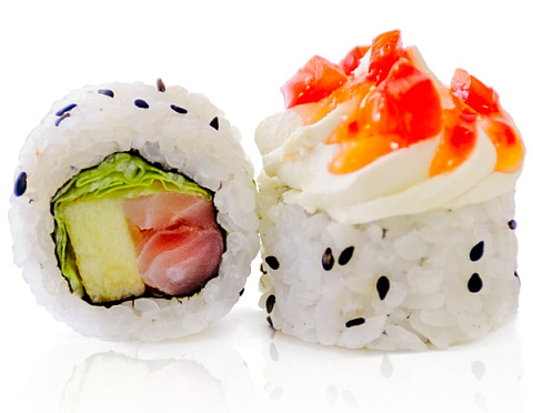 Жареный лосось, сливочный сыр, соус Терияки, авокадо, хлопья тунца