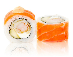 Копченый лосось, креветка в темпуре, манго, сливочный сыр, соус Спайси