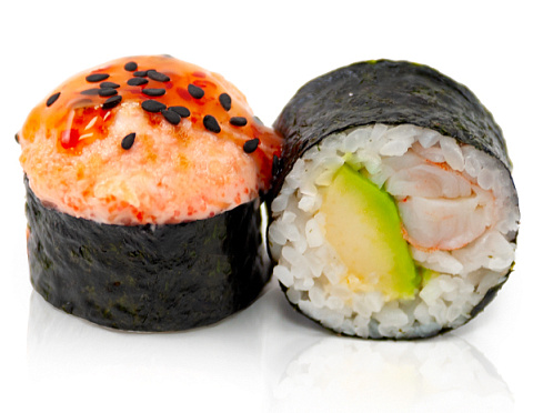 Креветка, авокадо, соус чили сладкий, кунжут, сырная шапка