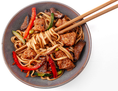 Свинина, соус хойсин, лапша пшеничная, цуккини, лук красаный, морковь, перец болгарский, бобы эдомаме, соевые ростки, кунжут, бульон вок, грибы шиитаке